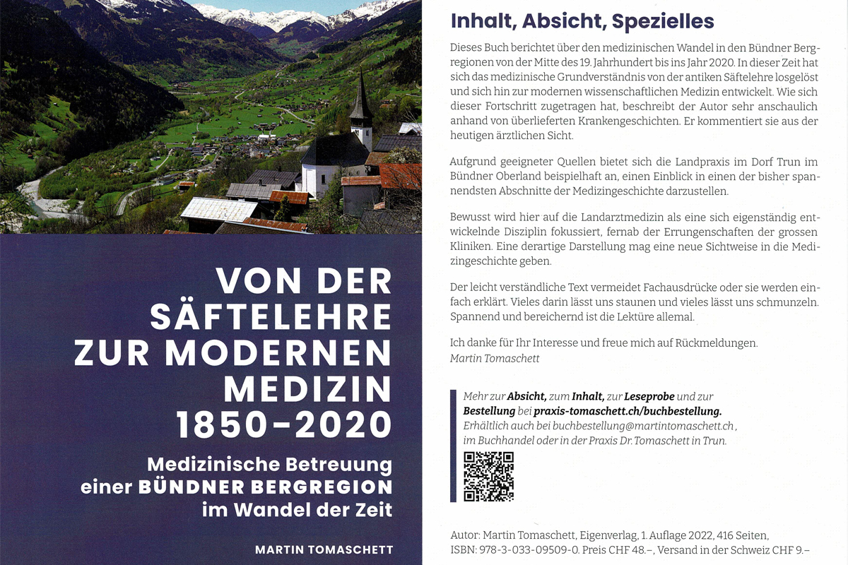 Dr. med. Martin Tomaschett ist Facharzt für Allgemeine Innere Medizin in Trun und Autor des Buches «Von der Säftelehre zur modernen Medizin 1850–2020», in dem er den medizinischen Wandel einer Bündner Landarztpraxis anhand überlieferter Krankengeschichten aus Trun aufzeigt – leicht verständlich und mit möglichst wenig Fachausdrücken.